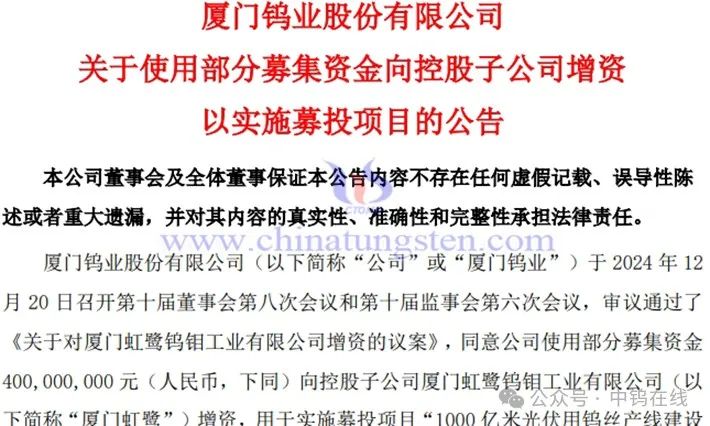 近日,厦门钨业发布公告称,第十届董事会第八次会议和第十届监事会第六次会议,审议通过了《关于对厦门虹鹭钨钼工业有限公司增资的议案》,同意公司使用部分募集资金400,000,000元向控股子公司厦门虹鹭增资,用于实施募投项目“1000亿米光伏用钨丝产线建设项目”。