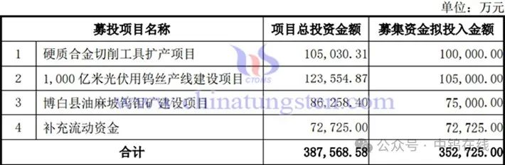 募集资金投资项目的使用计划如下:硬质合金切削工具扩产项目100,000万元,1,000亿米光伏用钨丝产线建设项目105,000万元,博白县油麻坡钨钼矿建设项目75,000万元,补充流动资金72,725万元。