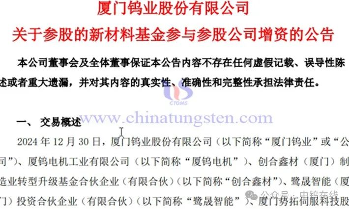 2024年12月30日,厦门钨业(下称“公司”)发布公告称,公司与厦钨电机、创合鑫材、鹭晟智能、势拓伺服签署了《增资协议》。公司参股公司势拓伺服以非公开协议方式增资3,000万元,其中公司参股的新材料基金创合鑫材出资2,997.3万元、鹭晟智能出资2.7万元,公司及厦钨电机不参与本次增资。本次增资扩股完成后,势拓伺服的注册资本由5,600万元增加至6,222.22万元,资本公积金增加2,377.78万元。