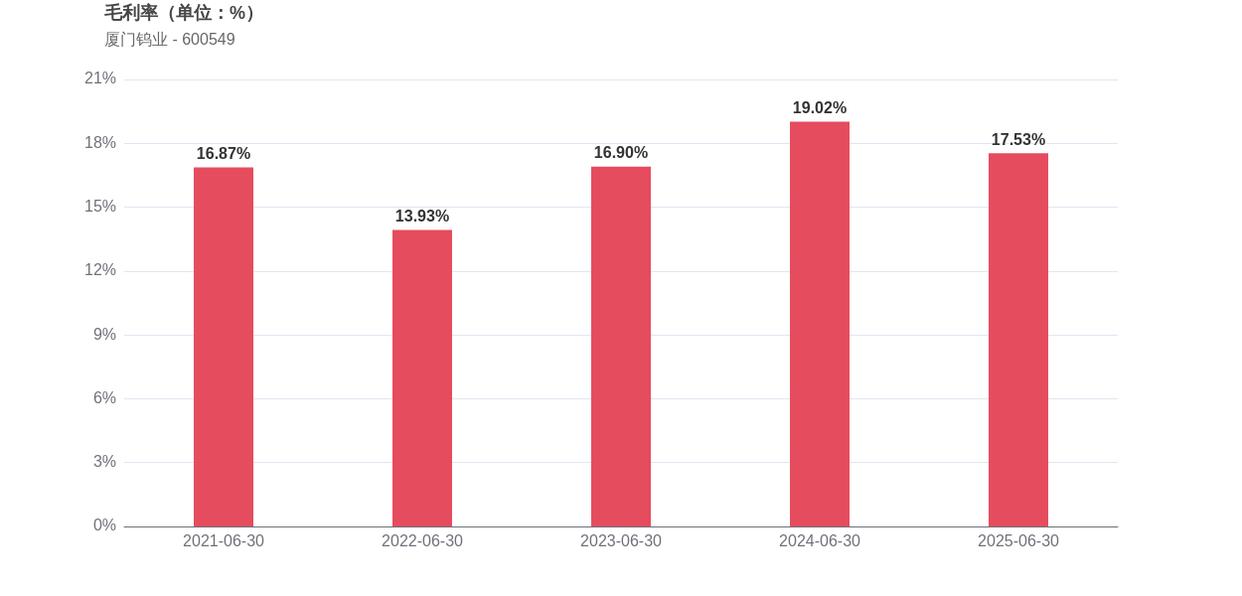 从反映盈利质量的指标来看,厦门钨业的净利率由2024年上半年的9.34%下滑至7.50%,下降了1.84个百分点。毛利率从2024年上半年的19.02%下滑至17.53%,下降了1.49个百分点。净资产收益率方面,2025年上半年为5.96%,同比下降了2.79个百分点。
