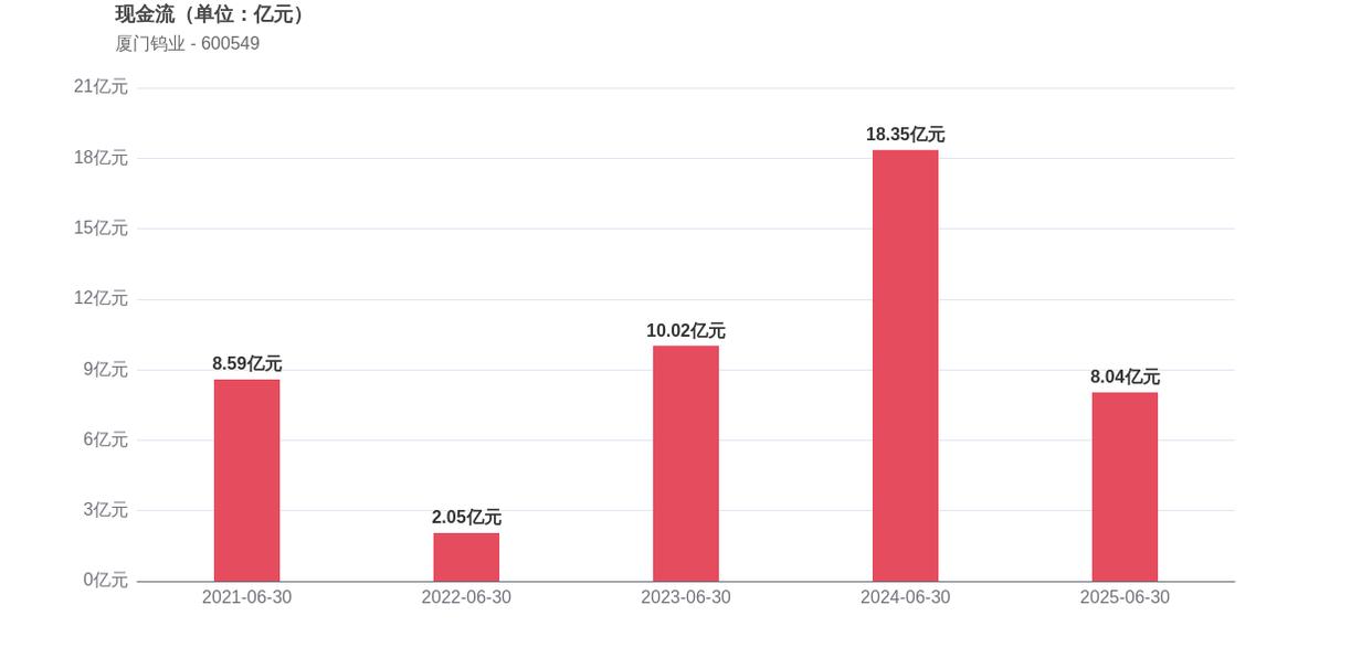 在经营稳健性方面,厦门钨业面临存货周转效率下降的挑战,存货周转天数为104.91天,较2024年上半年增长了4.74%,表明库存管理压力有所增加。经营活动产生的现金流净额为8.04亿元,相比2024年同期的18.35亿元,同比下滑了56.18%,显示出经营现金流获取能力明显减弱。此外,2025年上半年的资产负债率为47.43%,同比下降了4.51个百分点,这意味着公司债务结构得到优化。