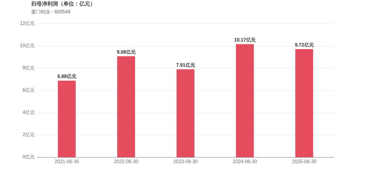 在2025年上半年,厦门钨业的经营业绩呈现增收不增利的态势。公司实现营业收入191.78亿元,同比增长11.75%,但归母净利润9.72亿元,同比下滑4.37%。