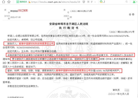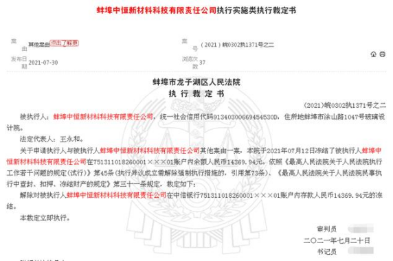 根据中国裁判文书网发布的《合肥众拓商贸有限公司、蚌埠中恒新材料科技有限责任公司执行实施类执行裁定书》即安徽省蚌埠市龙子湖区人民法院执行裁定书(2021)皖0302执1371号,“本院依据已经发生法律效力的蚌埠市龙子湖区人民法院生效的(2019)皖0302民初1490号法律文书,已向被执行人发出执行通知书,责令被执行人接到通知后立即履行上述法律文书确定的义务,但被执行人至今未履行。依照《中华人民共和国民事诉讼法》第二百四十二条、第二百四十三条、第二百四十四条,《最高人民法院关于适用〈中华人民共和国民事诉讼法〉的解释》第四百八十七条的规定,裁定如下:查封、扣押、冻结、划拨、扣留、提取被执行人蚌埠中恒新材料科技有限责任公司价值14369.94元的相关财产。”