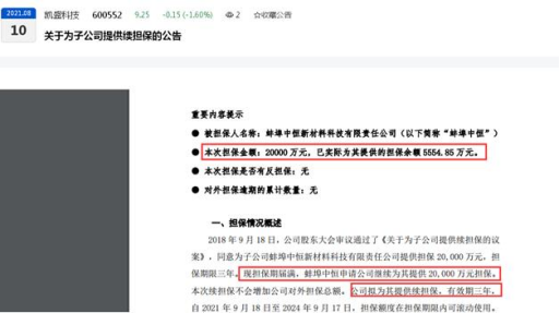 8月10日,凯盛科技披露《关于为子公司提供续担保的公告》,称公司拟为全资子公司蚌埠中恒提供20000万元担保,担保有效期三年,自2021年9月18日至2024年9月17日,担保额度在担保期限内可滚动使用。公司股东大会批准后,蚌埠中恒在签订贷款协议时,由公司审核同意后为其签署担保协议。