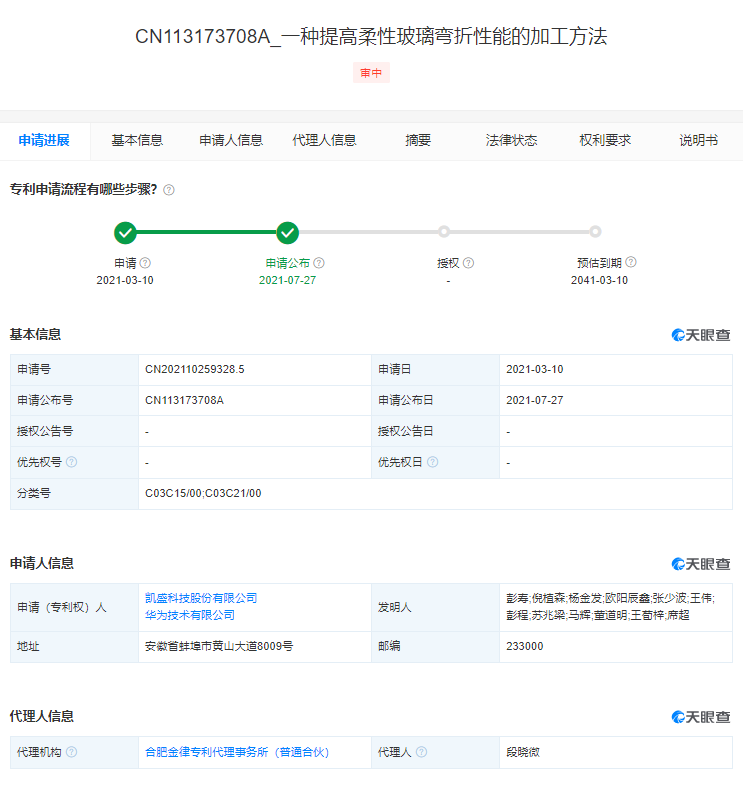 据天眼查数据显示,7月27日,华为技术有限公司公开“一种提高柔性玻璃弯折性能的加工方法”发明专利,公开号为CN113173708A,申请日期为2021年3月,申请人为:凯盛科技股份有限公司和华为技术有限公司。