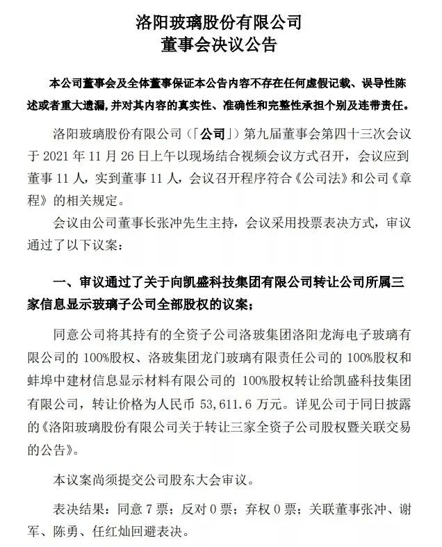 11月26日,洛阳玻璃公告,拟以5.36亿元的价格将其持有的信息显示玻璃业务板块全资子公司龙海玻璃100%股权、龙门玻璃100%股权和蚌埠中显100%股权转让予公司间接控股股东凯盛科技集团。此次交易完成后,洛阳玻璃将不再从事信息显示玻璃业务。
