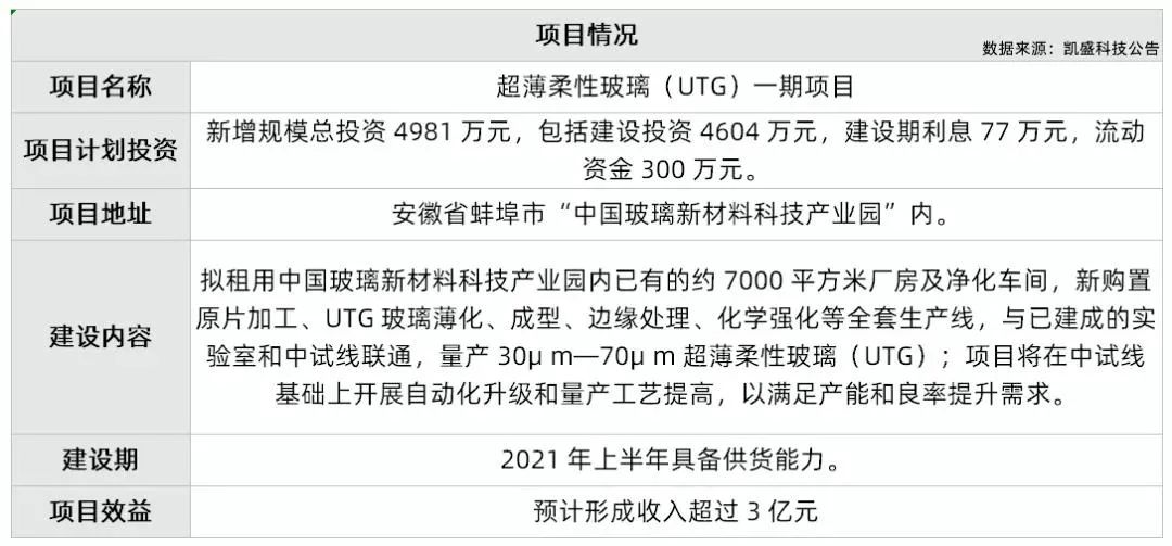 2020年11月30日,凯盛科技发布《关于投资建设超薄柔性玻璃(UTG)一期项目的公告》表示,公司拟在现有中试线的基础上,再新增投资4981万元,建设超薄柔性玻璃(UTG)一期项目,量产6-8寸30μm—70μm超薄柔性玻璃(UTG)。