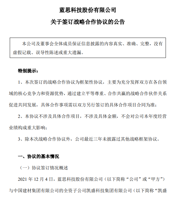 同时公告中也透露,凯盛科技集团与蓝思科技还将在上游原料和新材料等方面开展合作。