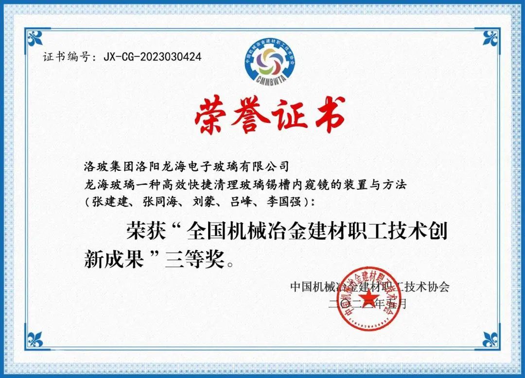 日前,中国机械冶金建材职工技术协会揭晓了2023全国机械冶金建材行业职工技术创新成果获奖名单,龙海玻璃生产制造部创新项目“一种高效快捷清理锡槽内窥镜的装置与方法”荣获“全国机械冶金建材行业职工技术创新成果”三等奖。公司始终坚持创新驱动高质量发展的理念,以技术创新实践活动为依托,用工匠精神引导员工结合工作实际,立足岗位破解发展和技术难题,持续激发员工创新热情和创效活力,促进创新成果应用和转化,以技术创新的强大引擎,推动企业高质量发展。