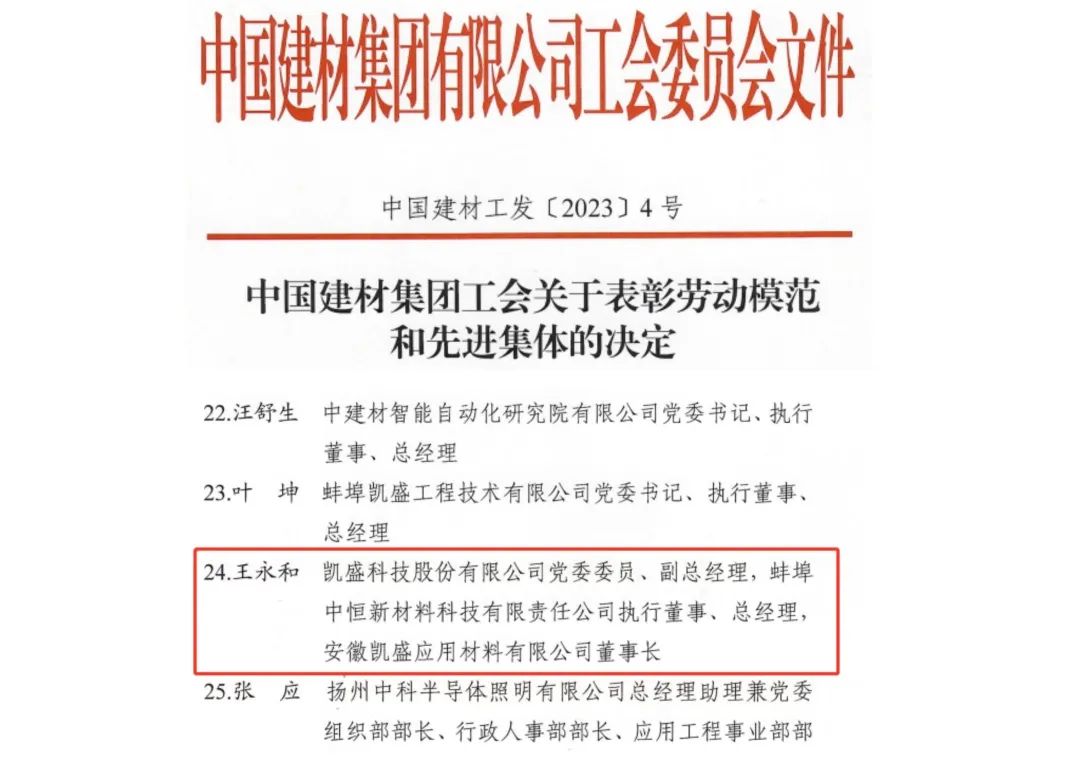 日前,凯盛科技股份党委委员、副总经理,蚌埠中恒执行董事、总经理,凯盛应材董事长王永和被授予“中国建材集团劳动模范”称号。王永和同志30多年来致力于无机非金属粉体材料性能和制备工艺研究,主持完成了国家火炬计划项目“高纯超细氧化锆项目”,安徽省火炬计划项目“高纯超细电熔氧化锆项目”和“6000吨/年超细硅酸锆项目”,安徽省重大科技专项“高纯超细电子功能粉体材料”、“高纯超细球形硅微粉”等一批国家和省重点项目的研发攻关和建设工作。近年来,以他为核心的研发团队刻苦攻关,开发出纳米氧化锆、钛酸钡、稀土抛光粉、合成二氧化硅等国内领先的新产品,取得了国家制造业单项冠军产品“电熔氧化锆”、国家重点新产品“ZC系列高纯电熔氧化锆”、安徽省首批次新材料“5G高频覆铜板用高纯超细球形石英粉”等科技成果,2022年应用材料板块营业收入超16亿元,利润总额超3亿元,用良好效益推动企业高质量发展。