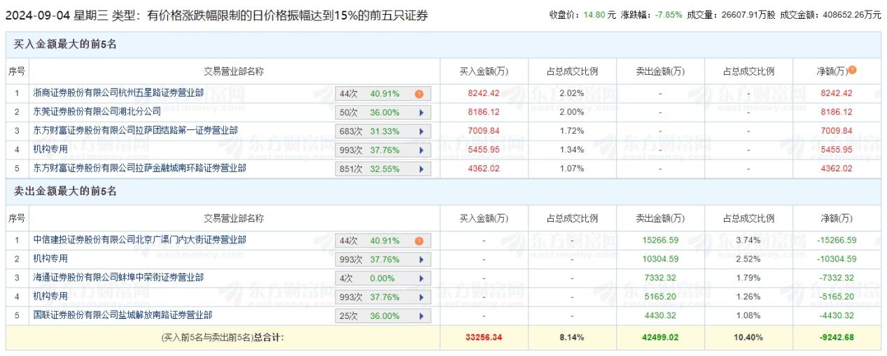其中,买二为思明南路,买入8186.12万元;买三为东方财富证券股份有限公司拉萨团结路第一证券营业部,买入7009.84万元;买五为东方财富证券股份有限公司拉萨金融城南环路证券营业部,买入4362.02万元。