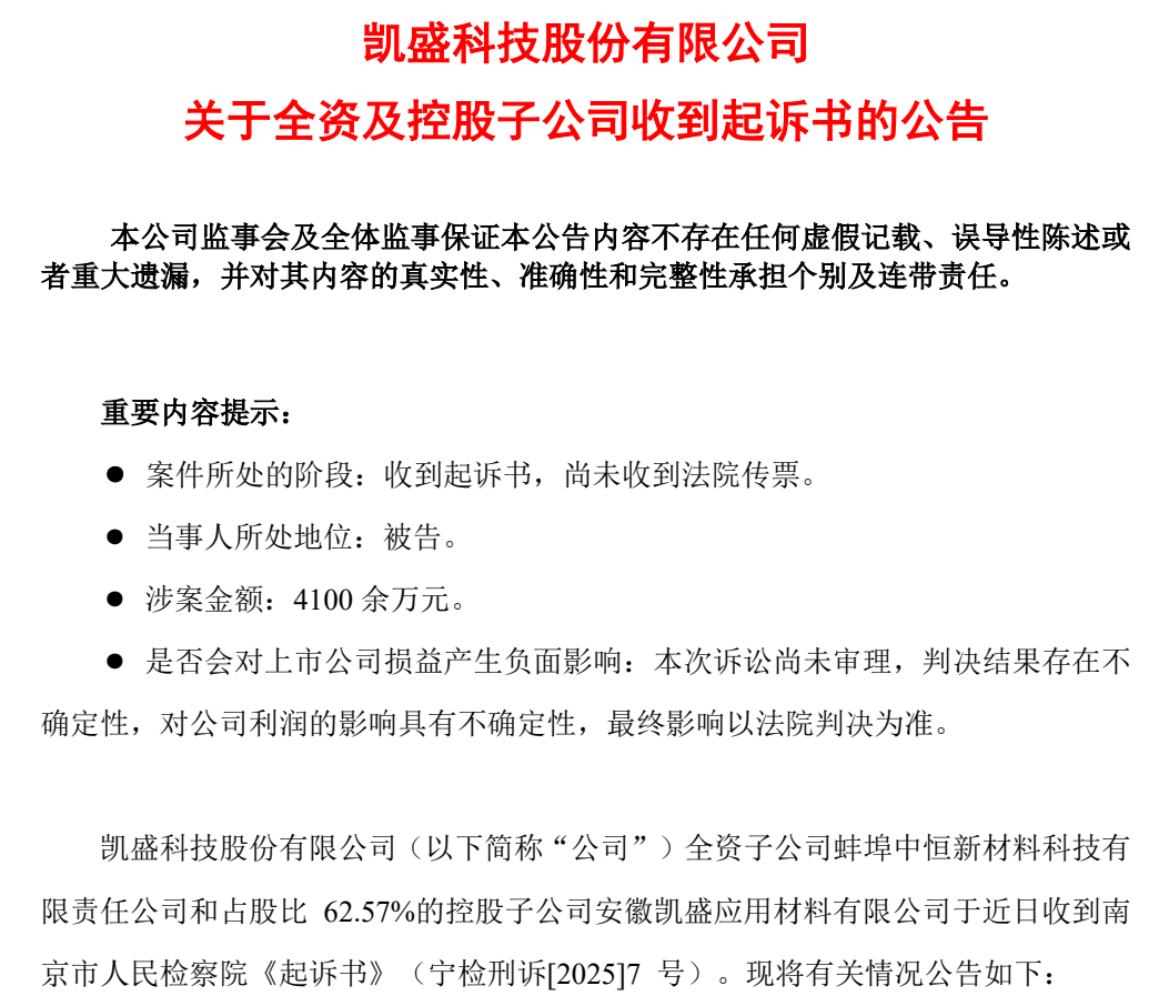 4月18日消息,凯盛科技股份有限公司全资子公司蚌埠中恒新材料科技有限责任公司和占股比 62.57%的控股子公司安徽凯盛应用材料有限公司近日收到南京市人民检察院《起诉书》。案件所处阶段为收到起诉书,尚未收到法院传票,公司为被告。涉案金额达 4100 余万元。本次诉讼未对中恒公司、凯盛应材及本公司日常生产经营活动产生影响,尚未审理,判决结果对公司利润影响有不确定性,公司将根据进展及时披露,提醒投资者关注后续公告及投资风险。