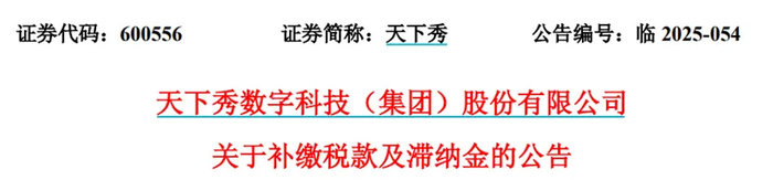 上市公司 天下秀 (600556.SH)发布了一份公告,披露经公司对涉税业务自查,因双方对税收政策适用条件理解有偏差,导致公司子公司共需补缴税款及滞纳金2451.57万元。本次补缴税款及滞纳金预计将减少公司2025年度净利润约2384.13万元,占公司最近一期经审计归属于上市公司股东净利润的46.3%。