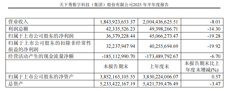 天下秀2025年半年度报告显示,其营业收入为18.44亿元,同比下降8.01%,归母净利润为0.36亿元,同比下降19.28%。