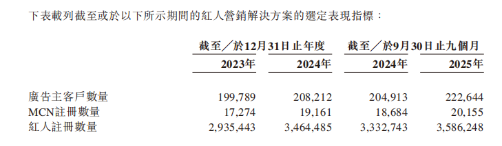据其招股书,公司截至2025年9月30日的广告主客户数量为222644家,MCN注册数量为20155家,红人注册数量为3586248个。由此来看,相较于2023、2024年,其上述指标规模仍在扩大,平台规模仍在扩张。