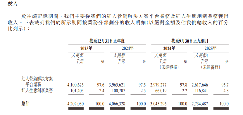 而其招股书数据显示,截至2025年9月30日,天下秀的红人营销解决方案平台业务收入占比为95.7%,红人生态创新业务收入占比为4.3%。