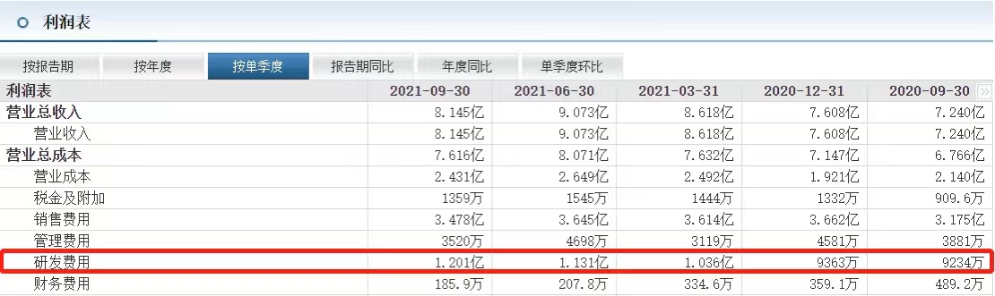 而根据康缘药业董秘在互动平台的回复,三季度利润偏少主要是公司研发费用投入相比同期较高所致,然而,查询公司的利润表却发现,今年前三季度,康缘药业的研发费用分别为1.036亿,1.131亿和1.201亿,总体分布较为均衡,并不存在三季度研发费用突然“加码”的情况。