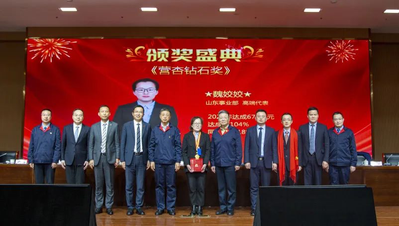 颁奖环节中,最激动人心的就是颁发公司最高奖项“营杏钻石奖”,山东事业部济宁省公司魏姣姣三次荣获“营杏金杏奖”,最终获得该项大奖,也成为康缘首位“营杏钻石奖”获得者。魏姣姣激动地表示,2023年她个人经历了风雨洗礼,也看到了美丽风景,取得了沉甸甸的收获。2024年,她希望,康昊公司所有人员都能紧紧围绕“两个瞄准一个标准”,聚焦学术加速转型,把康缘独家创新中药学术信息精准传递给医生,都能成为超级达标代表,挣到钱!