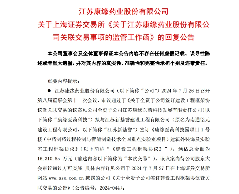 2024年7月份,康缘药业宣布,为保障中药制药过程控制与智能制造技术全国重点实验室项目建设的正常推进,康缘药业全资子公司江苏康缘医药科技发展有限责任公司(简称“康缘医药科技”)与江苏新基誉建设工程有限公司(以下简称“江苏新基誉”,原名为南通铭元)拟签订《康缘医药科技园项目1号楼建筑外装饰及实验室工程框架协议》,约定江苏新基誉向康缘医药科技提供建筑外装饰及实验室工程项目建设服务,预估总金额为1.63亿元(工程项目具体金额按后续签订的正式施工合同据实结算)。