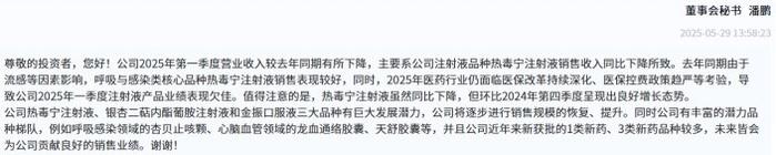 对于一季度业绩下降的情况,康缘药业董秘潘鹏在业绩说明上回复称,一季度营收下滑主要系公司注射液品种热毒宁注射液销售收入同比下降所致。潘鹏表示,去年同期由于流感等因素影响,呼吸与感染类核心品种热毒宁注射液销售表现较好,同时,2025年医药行业仍面临医保改革持续深化、医保控费政策趋严等考验,导致公司2025年一季度注射液产品业绩表现欠佳。