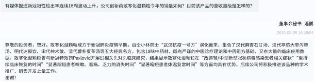 而散寒化湿颗粒则是新冠肺炎治疗的中药药物,成方于新冠肺炎疫情早期,由仝小林院士“武汉抗疫一号方”演化而来。然而对于这款治疗新冠有改善效果的中药,公司却迟迟未披露其销售情况。证券之星注意到,在业绩说明会中,有投资者向公司提问散寒化湿颗粒今年的销量和营收情况,潘鹏未予以正面回应,其表示,后续公司将积极推进该品种的学术推广、销售开发上量工作。