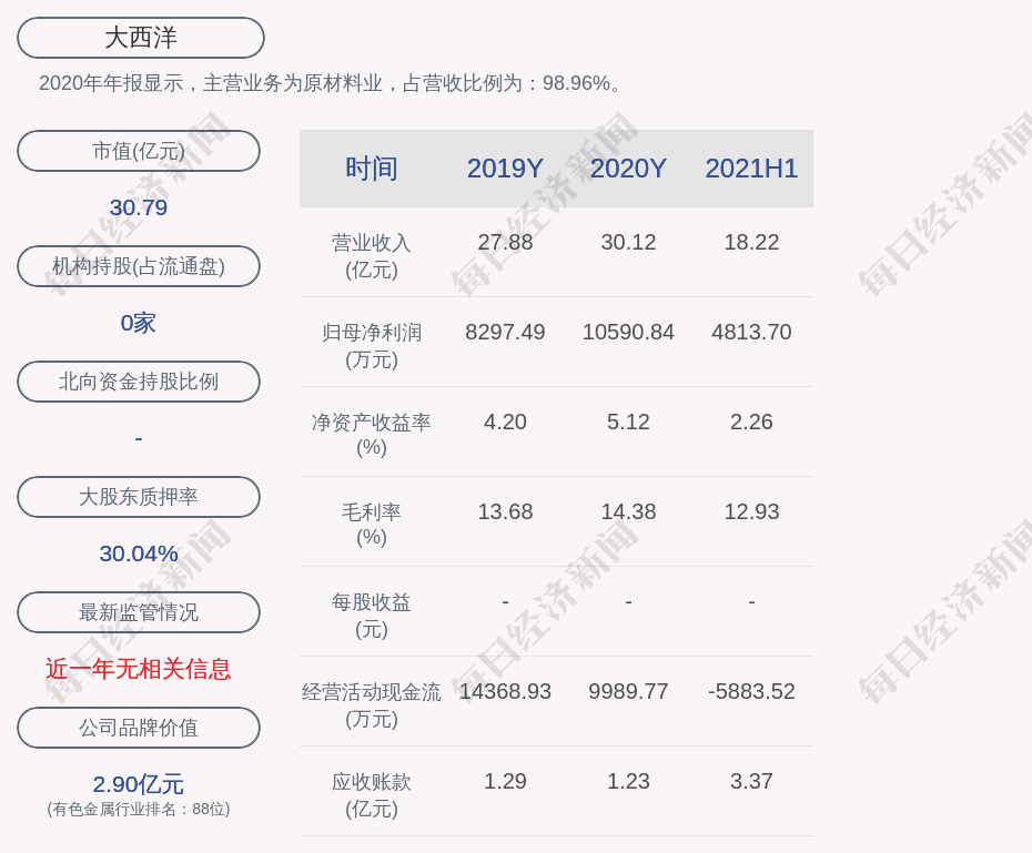 2020年年报显示,大西洋的主营业务为原材料业,占营收比例为:98.96%。