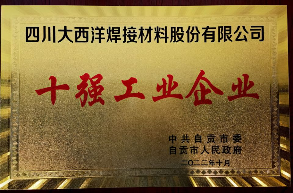 近日,市委市政府隆重召开“决战四季度、大干一百天”全市工业发展大会。会上,市委、市政府对自贡市优秀企业家、十强工业企业和二十强成长型工业企业进行表彰。四川大西洋焊接材料股份有限公司获评“十强工业企业”。