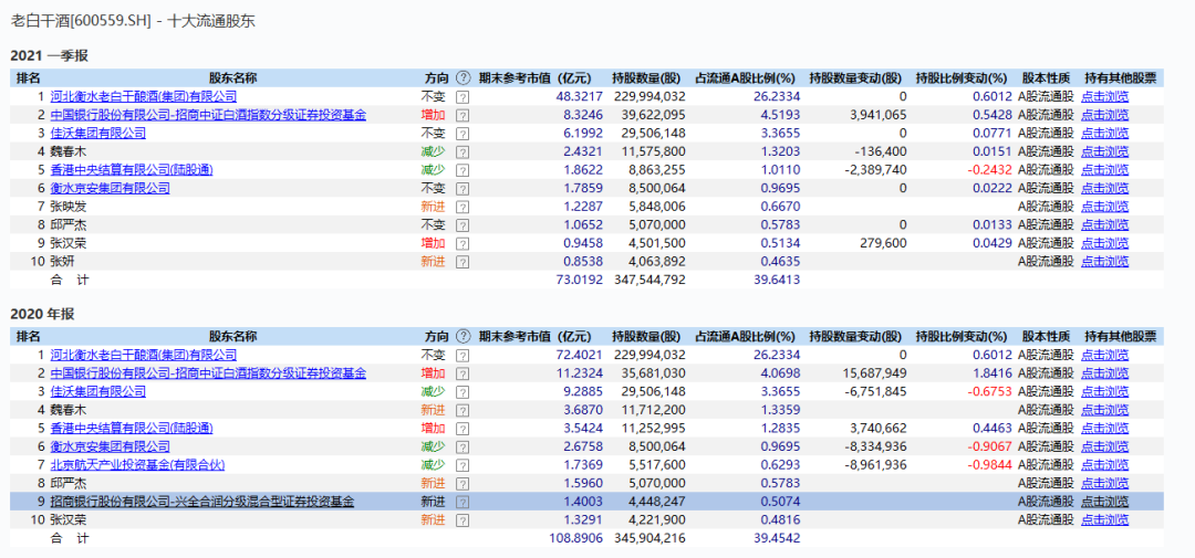 据wind数据显示,2021年1季报中仅出现招商中证白酒和万家战略发展两只基金产品配置,其中招商中证白酒为指数基金,这也就意味着大量配置老白干酒的主动型基金产品仅万家战略发展一只。