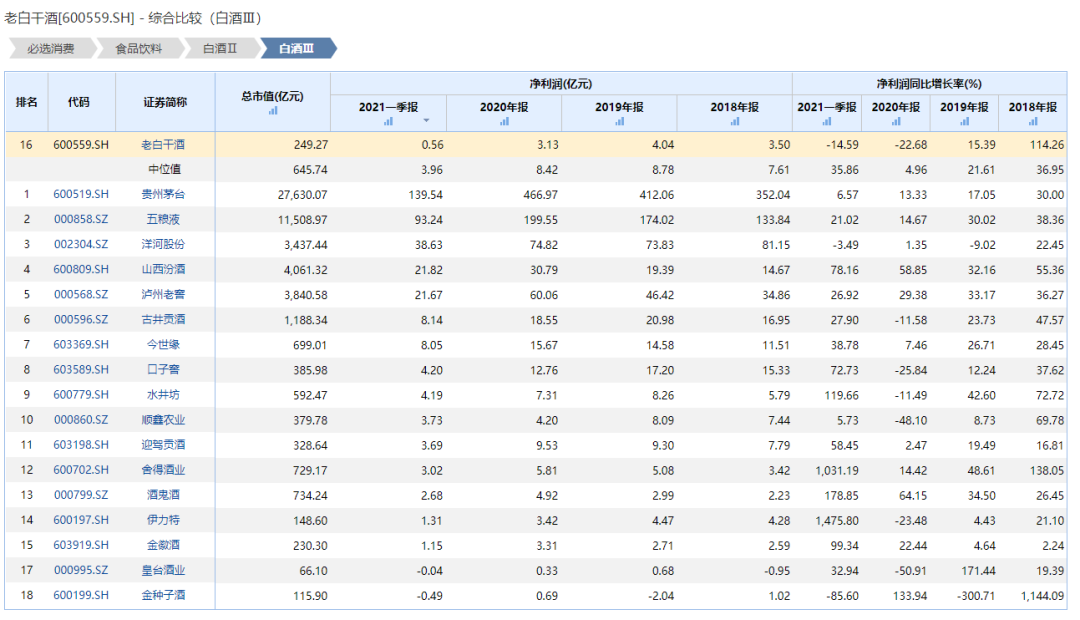 目前,A股共有18家白酒上市公司,以2020年年报来看,老白干酒净利润3.13亿元排名倒数第3位,净利润同比增长-22.68%排名倒数第5位。以今年一季报来看,老白干酒净利润0.56亿元排名倒数第3位,净利润同比增长-22.68%排名第2位。