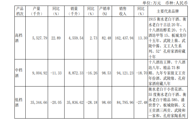 据老白干酒年报,公司对低、中、高档酒的价位分别为40 元以下(含 40 元)为低档产品,40 元至100 元(含100 元)为中档产品,100 元以上为高档产品,三类酒产品中只有高档酒的销售收入实现了同比增长,其余两类均有较大幅度的收入下滑。
