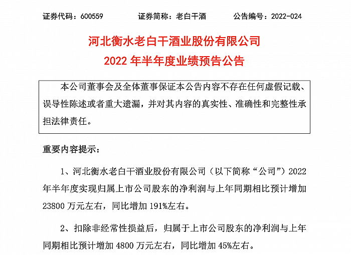 对于业绩提升,老白干酒在公告中指出,主要系于公司不断优化产品结构,深化市场建设,2022年上半年度主营业务收入增长所致。