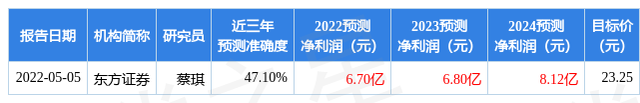 证券之星数据中心根据近三年发布的研报数据计算,东方证券蔡琪研究员团队对该股研究较为深入,近三年预测准确度均值为47.1%,其预测2022年度归属净利润为盈利6.7亿,根据现价换算的预测PE为34.61。