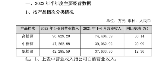 上半年老白干酒高档酒、中档酒以及低档酒分别实现收入9.68亿元、4.73亿元以及4.23亿元,同比增长30.14%、20.99%以及12.36%。