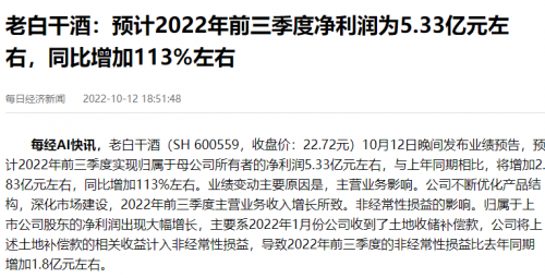 以衡水老白干为例,近日衡水老白干发布了前三季度的业绩预告,数据显示衡水老白干在2022年前三季度,实现净利润与上年同期相比预计增加2.83亿至5.33亿元左右,同比增加113%左右;扣非净利利润预计增加9300万元左右,同比增加41%左右。