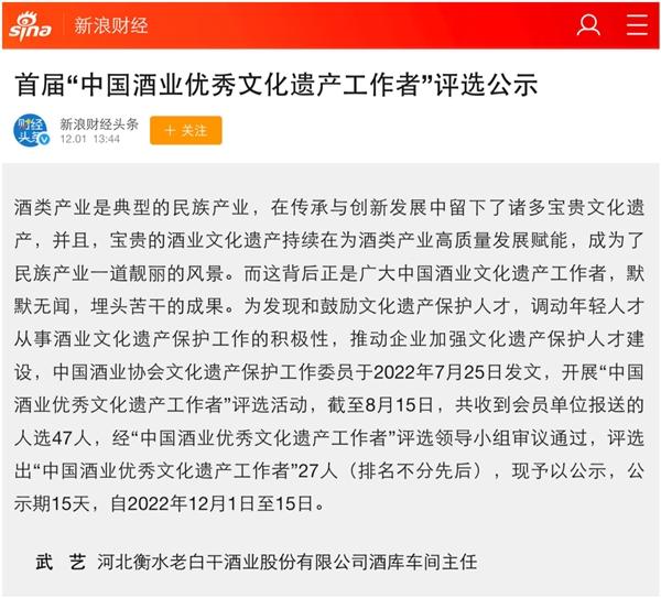 酒,是中华之魂,是传承之根,酒类产业是典型的民族产业,在传承与创新发展中留下了诸多宝贵文化遗产。为守护并传承这些民族文化,由中国酒业协会文化遗产保护工作委员于2022年7月25日开展的“中国酒业优秀文化遗产工作者”评选活动正式进入公示阶段,共评选出“中国酒业优秀文化遗产工作者”27人。其中,就有衡水老白干酿酒股份有限公司酒库车间主任—武艺。于武艺而言,这份荣誉也意味着更大的责任,今后他不仅要踏踏实实做好酿酒事业,更要以昂扬的精神投身到“中国白酒文化遗产保护”工作中去。