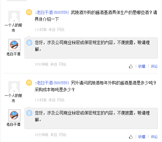 对此,老白干回答称,您好,涉及公司商业秘密或保密规定的内容,不便披露,敬请理解。
