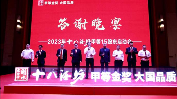 大会的高潮阶段——2023年十八酒坊甲等15股东启动仪式,衡水老白干营销有限公司营销总监刘伟、河北钰泉商贸总经理李明维与18家股东商会董事一起上台,手持象征金色未来与繁荣昌盛的金沙倾泻挥洒,2023年十八酒坊甲等15股东启动仪式金字浮现,2023年十八酒坊甲等15股东大会盛大起航,开启厂商“同心同行、共商共赢”的新征程。