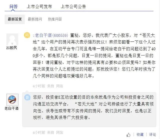 日前,有投资者在上证e互动对老白干酒(600559)董秘表示:董秘,您好。我代表广大小股东,对“苍天大地”这个用户的提问再次表示强烈抗议!麻烦您翻看一下这个人过去几年,在互动平台专门而且是唯一提问给老白干的问题达到了400多个,都是那几个问题,日复一日的提问,董秘也是日复一日的回答!请问董秘,对于这样的提问真有必要和必须回复吗?如果你再次回复这个人之前提过的问题,那就投诉您!您们几年时候为了几个同样的问题唱双簧唱好几年。
