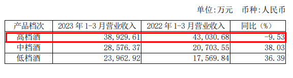 经营数据中,其高档酒营收3.9亿元,同比下滑9.53%,占比约39%;中档酒和低档酒营收分别为2.9亿元和2.4亿元,同比增幅均在36%以上。