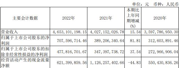 昨晚,老白干酒公布2022年年度报告,2022年,公司实现营业收入46.53亿元,同比增长15.54%;归属于上市公司股东的净利润7.08亿元,同比增长81.81%;归属于上市公司股东的扣除非经常性损益的净利润4.78亿元,同比增长37.54%;经营活动产生的现金流量净额6.21亿元,同比减少44.83%。
