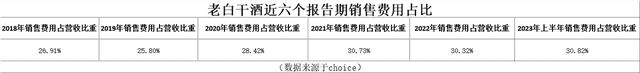 2018年、2019年、2020年、2021年、2022年、2023年上半年,老白干酒的销售费用占比分别为26.91%、25.8%、28.42%、30.73%、30.32%、30.82%,销售费用占比为上升状态。