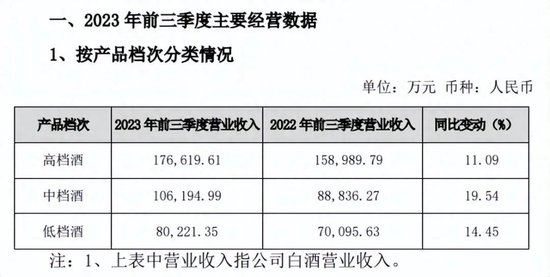 2023年前三季度,老白干酒的高档酒营收17.66亿元,同比增长11.09%,增速低于中低档酒的19.54%、14.45%。