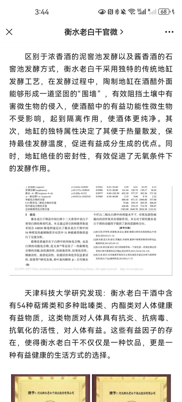 据公开报道,在2023年10月21日的一场分享会上,衡水老白干营销有限公司衡水高端酒大区团购经理曹君祥讲述,经实验证明衡水老白干酒中含有54种萜烯类和多种吡嗪类物质,这类物质对人体具有抗炎、抗病毒、抗氧化的活性。