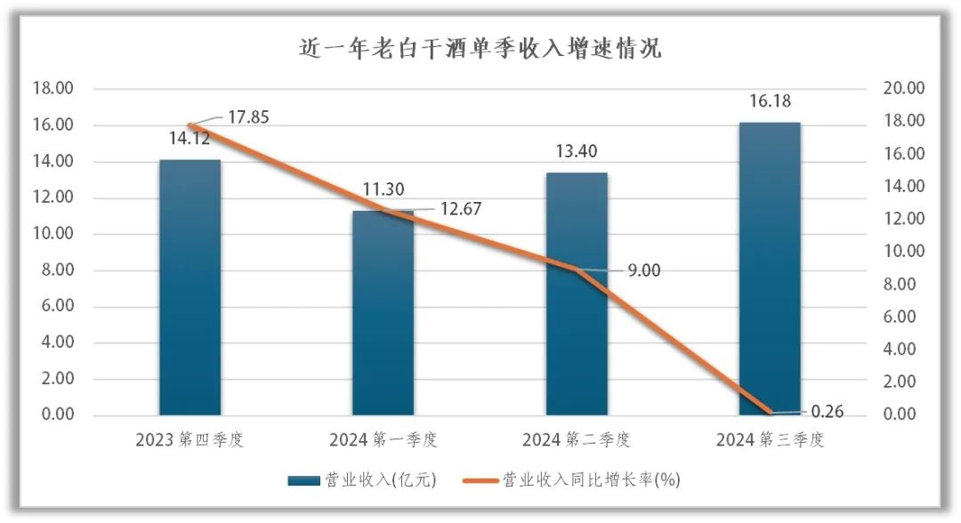 2023年第四季度,老白干酒营业收入为14.12亿元,同比增长17.85%;今年第一季度,营业收入为11.3亿元,同比增长12.67%;今年第二季度,营业收入为13.4亿元,同比增长9%。到了今年第三季度,营业收入为16.18亿元,同比增长0.26%。