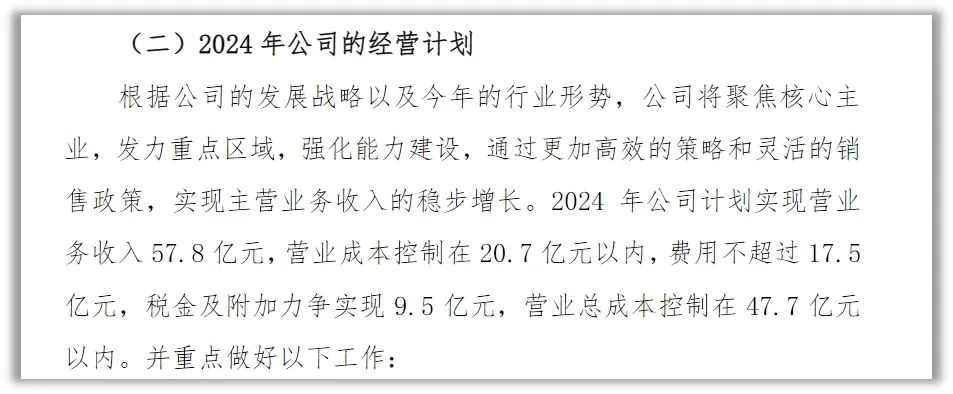 在老白干酒发布的《2023年年度股东大会会议资料》, 2024年的经营计划中着重提出了成本管控的目标。老白干酒计划在2024年内,“实现营业务收入57.8亿元,营业成本控制在20.7亿元以内,费用不超过17.5亿元,税金及附加力争实现9.5亿元,营业总成本控制在47.7亿元以内。”