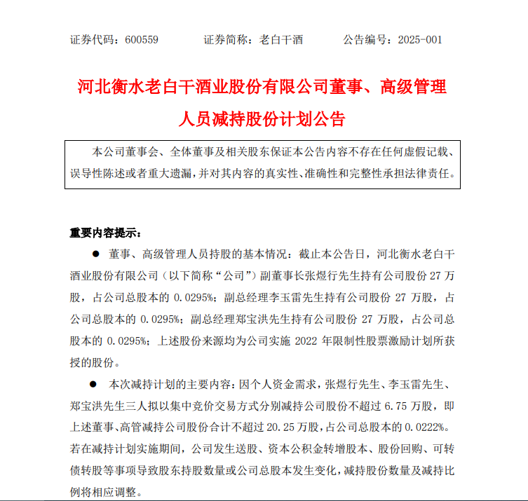 河北衡水老白干酒业股份有限公司(600559.SH)近期因核心管理层集体减持引发关注。公告显示,副董事长张煜行及副总经理李玉雷、郑宝洪拟通过集中竞价方式合计减持20.25万股,套现约380万元。叠加2024年57.8亿元营收目标完成存疑、股价较峰值缩水等多重压力,暴露出这家区域酒企面临的增长困境。