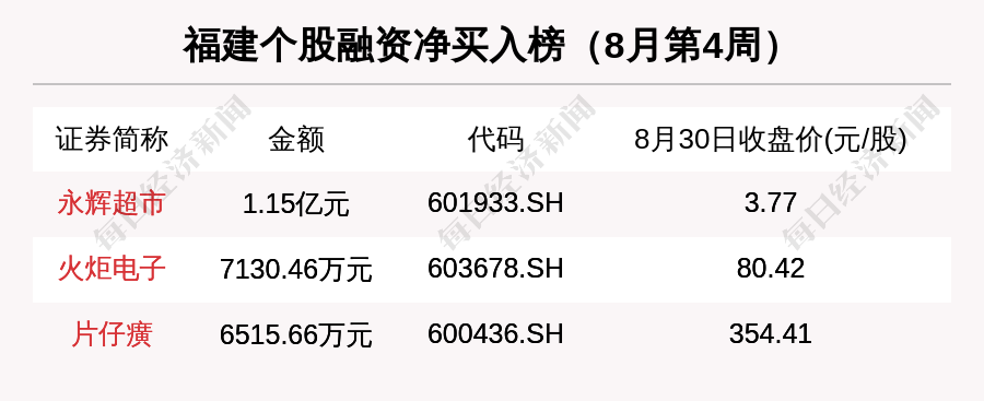 先看融资资金,8月第4周,福建板块融资净偿还总额为15.87亿元。融资净买入最多的福建股是永辉超市,金额是1.15亿元。其次是火炬电子(7130.46万元)和片仔癀(6515.66万元)。