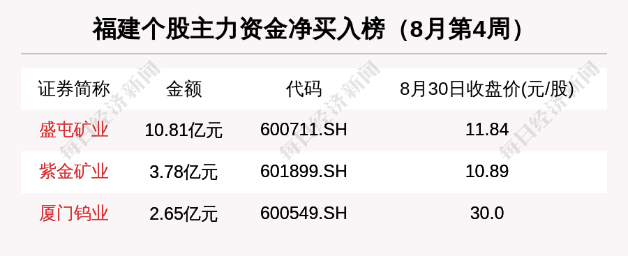 主力资金方面,8月第4周,盛屯矿业净买入额居首位,为10.81亿元,其次是紫金矿业(3.78亿元)和厦门钨业(2.65亿元)。