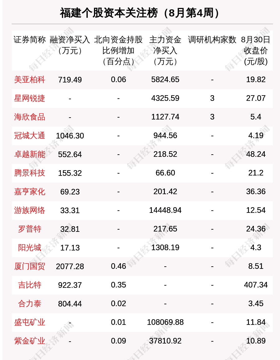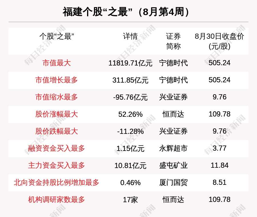 8月第4周(2021年8月23日~2021年8月29日),福建股中,宁德时代市值增长最多;兴业证券市值缩水最多;涨幅最大的是恒而达,上涨幅度为52.26%;跌幅最大的是兴业证券。此外,美亚柏科同时被主力资金,北向资金,融资资金看好。