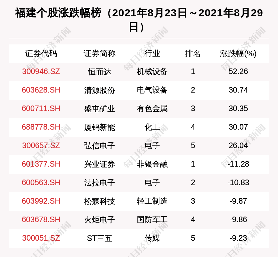 从涨跌幅来看,上周涨幅最大的福建公司是恒而达,上涨幅度为52.26%。跌幅最大的是兴业证券,下跌幅度为11.28%。